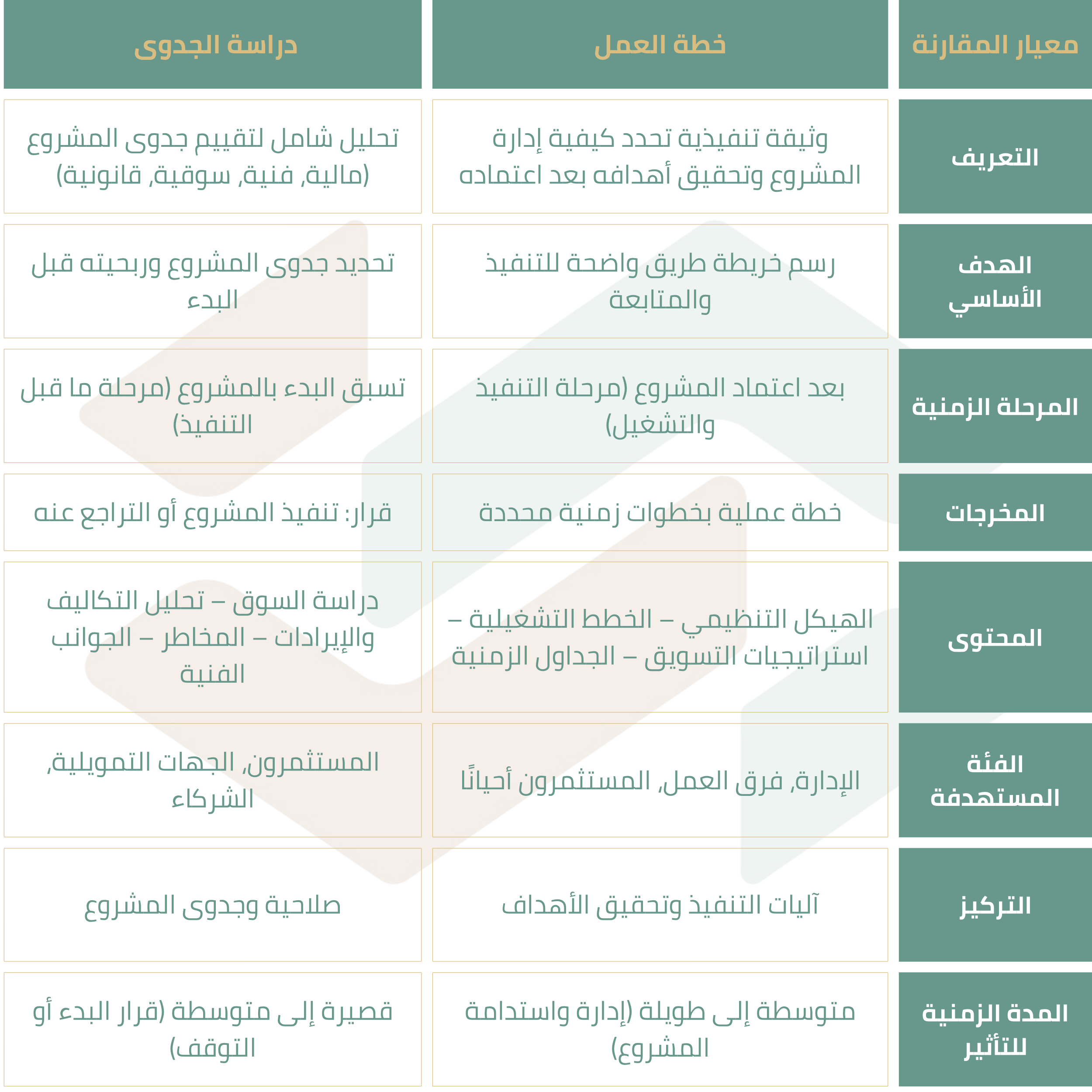 جدول مقارنة بين دراسة الجدوى وخطة العمل:
